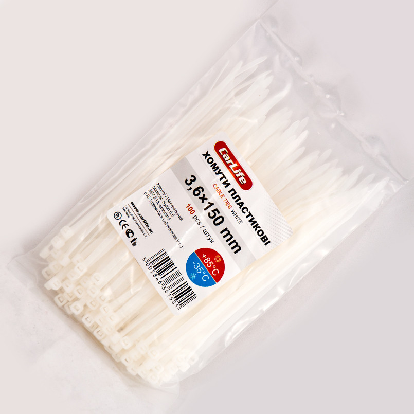 Опис: CARLIFE CARLIFE Хомути пластикові білі 3,6x150 (100шт.)