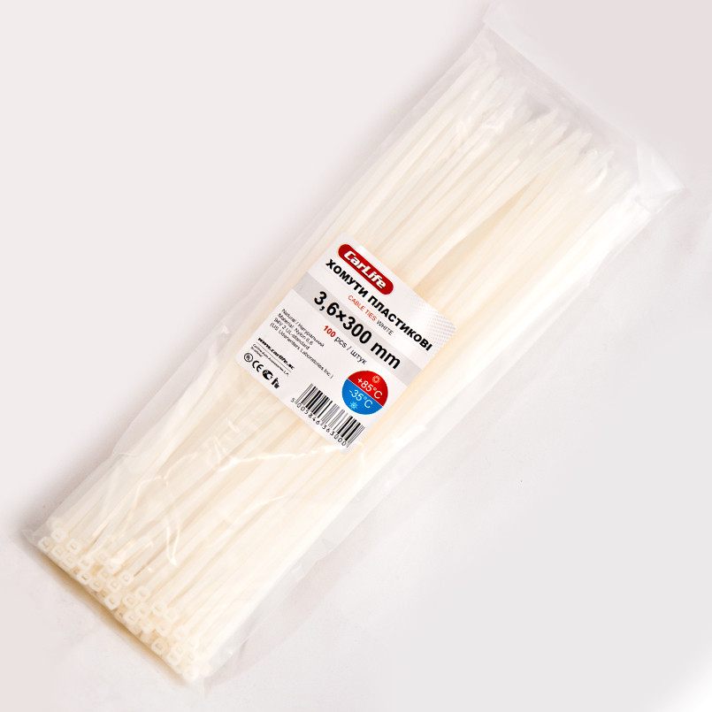 Опис: CARLIFE CARLIFE Хомути пластикові білі 3,6x300 (100шт.)