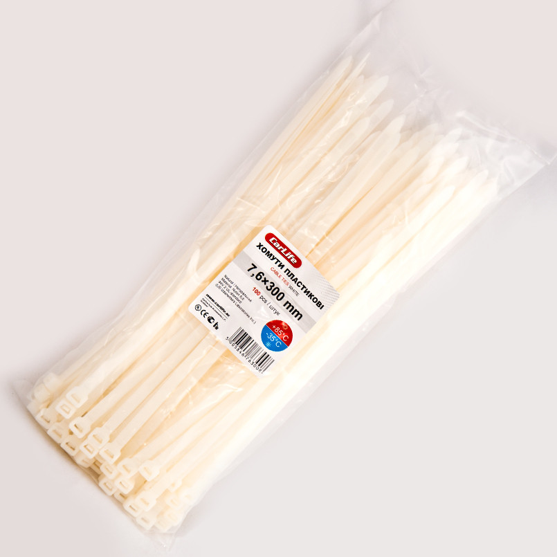Опис: CARLIFE CARLIFE Хомути пластикові білі 7.6x300 (100шт.)