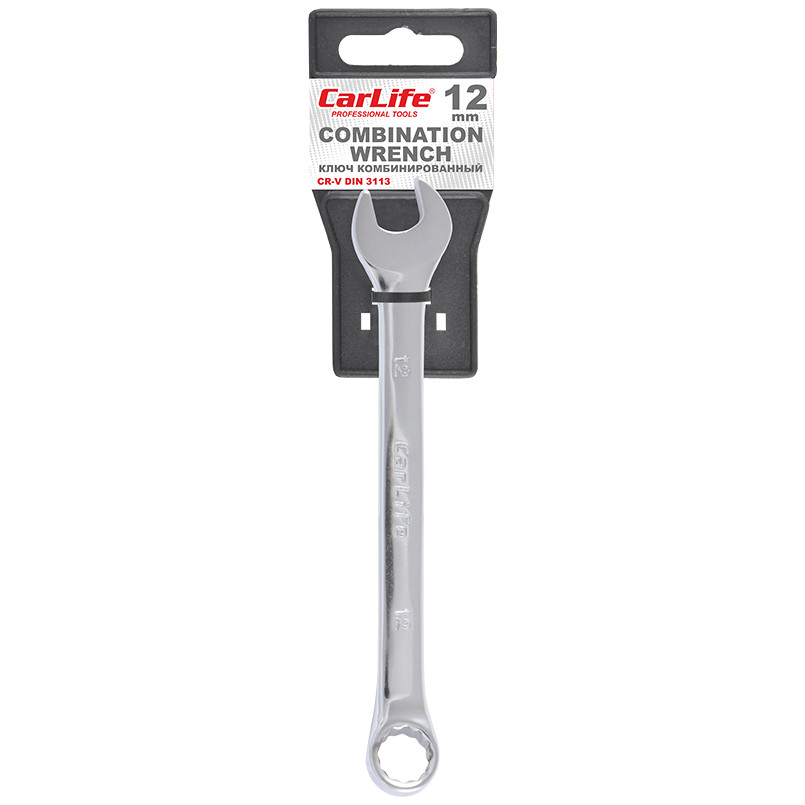 Опис: Ключ комбінований CARLIFE CR-V,12 мм, хромово-ванадієва сталь, нікель-хромоване покриття, кільце під кутом 15° DIN 3113, з тримачем