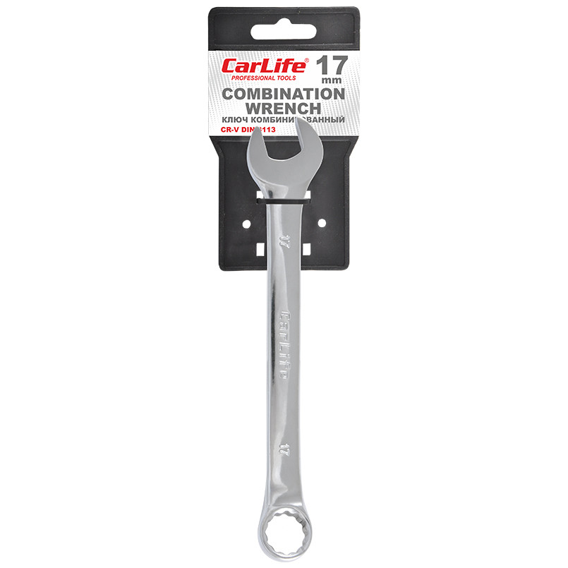 Опис: Ключ комбінований CARLIFE CR-V,17 мм, хромово-ванадієва сталь, нікель-хромоване покриття, кільце під кутом 15° DIN 3113, з тримачем