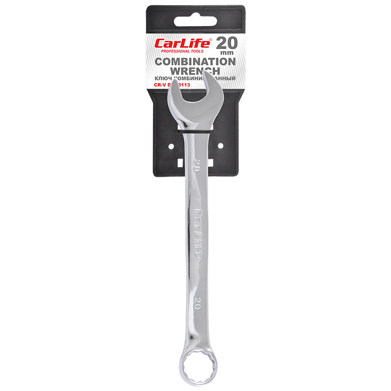Опис: Ключ комбінований CARLIFE CR-V,20 мм, хромово-ванадієва сталь, нікель-хромоване покриття, кільце під кутом 15° DIN 3113, з тримачем