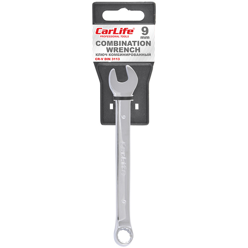 Опис: Ключ комбінований CARLIFE CR-V,9 мм, хромово-ванадієва сталь, нікель-хромоване покриття, кільце під кутом 15° DIN 3113, з тримачем