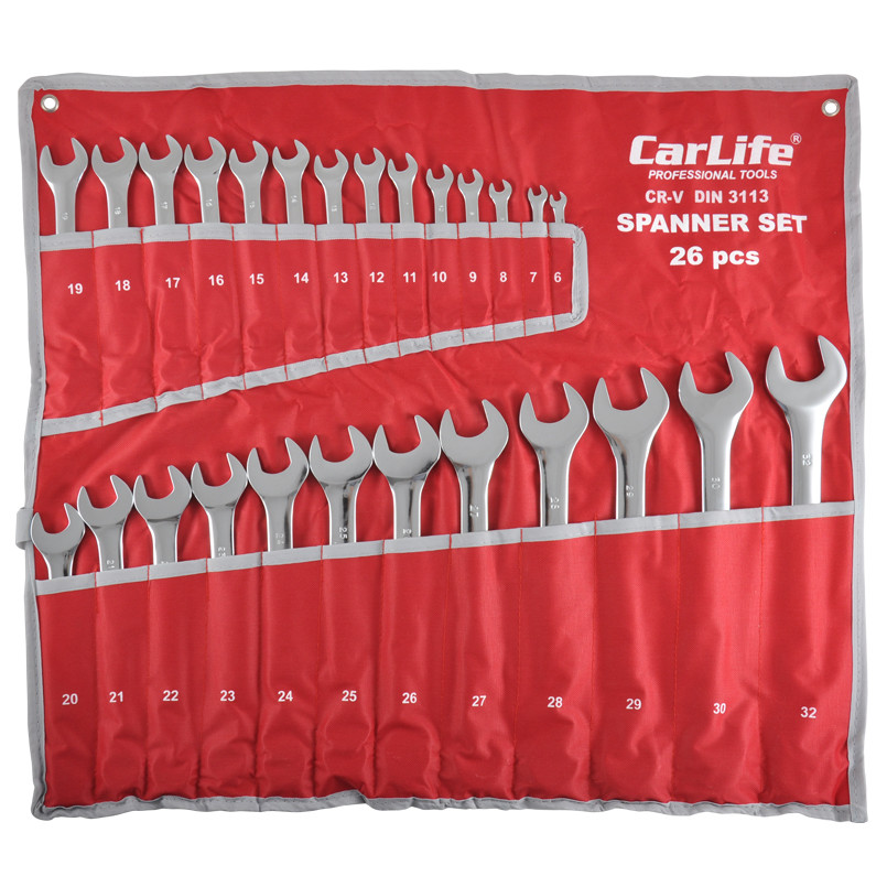Опис: Набір ключів комбінованих CARLIFE CR-V, 26шт., 6-32 мм, 6-7-8-9-10-11-12-13-14-15-16-17-18-19-20-21-22-23-24-25-26-27-28-29-30-32, хромово-ванадієва сталь, нікель-хромоване покриття, кільце під кутом 15°, DIN 3113, уп. чохол