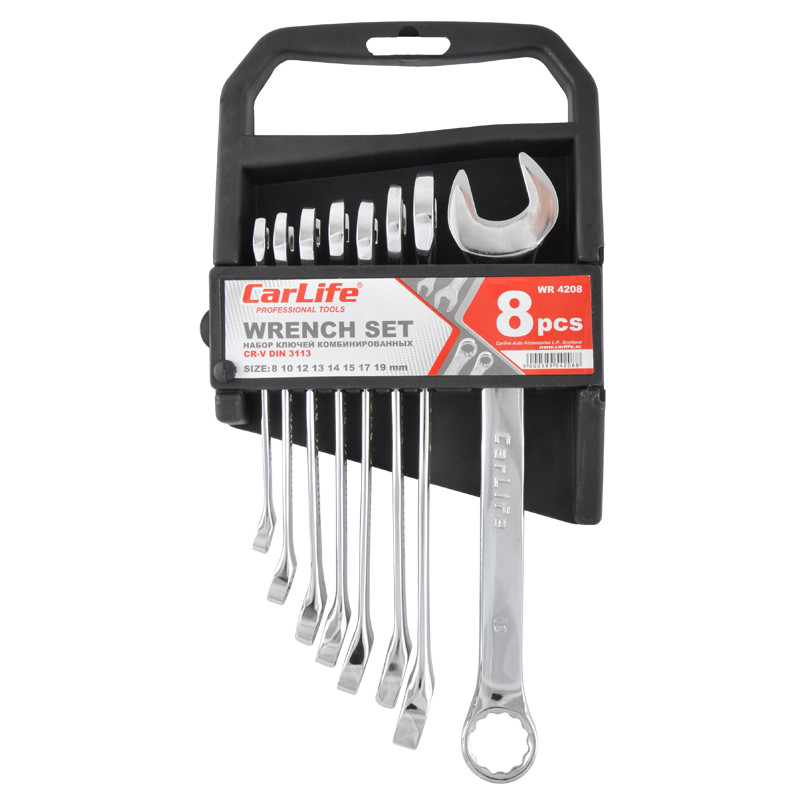 Опис: Набір ключів комбінованих CARLIFE CR-V, 8шт., 8-19 мм, 8-10-12-13-14-15-17-19, хромово-ванадієва сталь, нікель-хромоване покриття, кільце під кутом 15°, DIN 3113, уп. пластик
