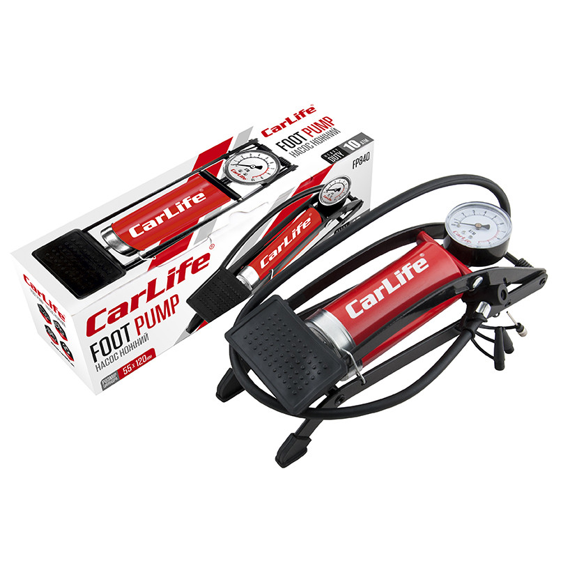 Опис: CARLIFE Carlife Помпа ножна CARLIFE 55ммx120мм, одноциліндрова з манометром та додатковими адаптерами, 10 Ат