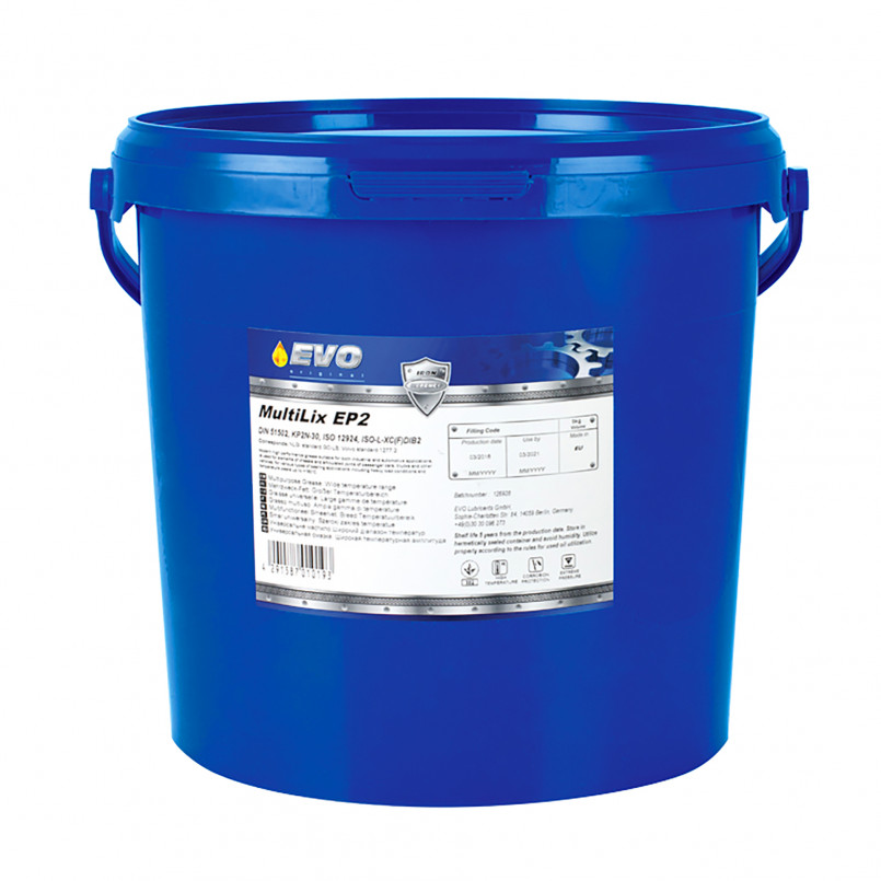 Опис: EVO MultiLix EP2 - колір синій. Консистентне багатоцільове мастило, виготовлене на основі високоякісної мінеральної оливи, загущеної літієвим комплексним милом. Рекомендована для використання в підшипниках , компонентах шассі, шкворнях , хрестовинах карданів, підшипників ступиць. Забеспечує стабільну роботу в широких діапазонах температур , стійкість до вимивання водою , захист від іржі , зносу та корозії. Діапазон температур -30℃ до +150℃ (max+180℃). Специфікації: NLGI 2, ISO 12924: L-XC(F)DIB2, DIN 51502: KP2N-30, NLGI GC-LB, Volvo1277.2