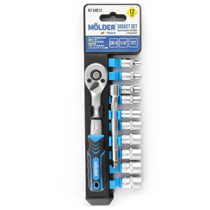Опис: MŌLDER Професійний набір головок торцевих з тріскачкою та подовжувачем 1/4_ 72Т, CR-V, 4-13 мм,12шт(5шт/уп)