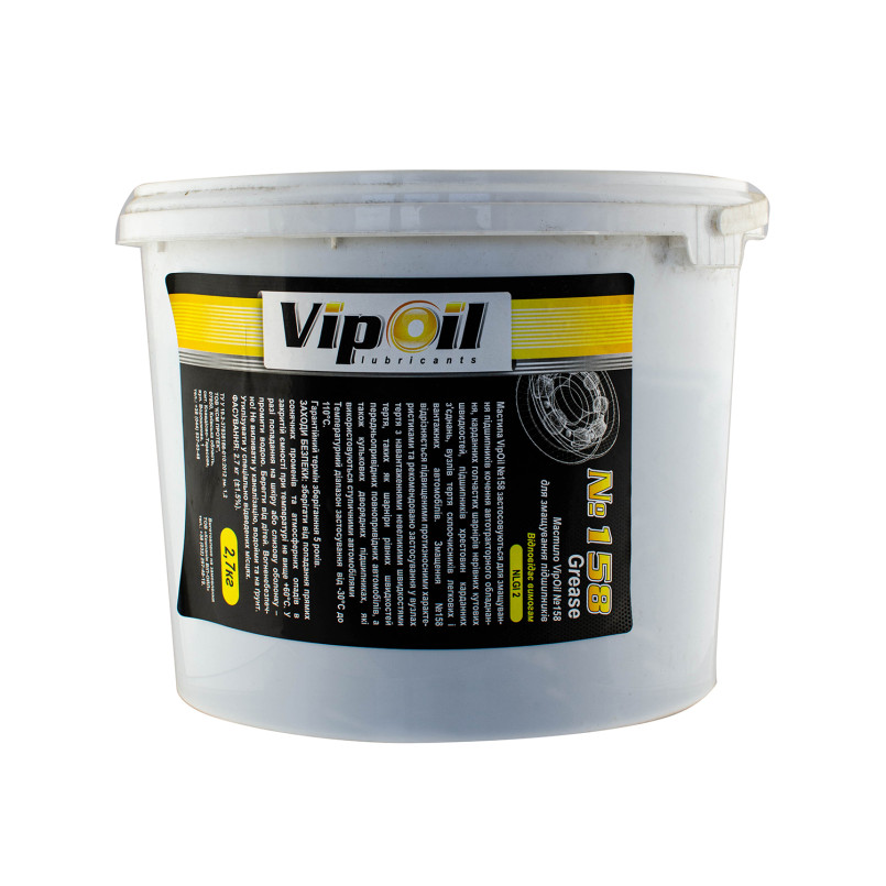 Опис: NLGI 2 Мастила VipOil №158 застосовуються для змащування підшипників кочення автотракторного обладнання, карданних голчастих шарнірів нерівних кутових швидкостей, підшипників хрестовин карданних з'єднань, вузлів тертя склоочисників легкових і вантажних автомобілів. Змащення №158 відрізняється підвищеними протизносними характеристиками та рекомендовано застосування у вузлах тертя навантаженнями невеликими швидкостями тертя, таких як шарніри рівних швидкостей передньопривідних повно привідних автомобілів, а також кулькових дворядних підшипниках, які використовуються ступичними автомобілями.Температурний діапазон застосування від -30°С до 110°С.