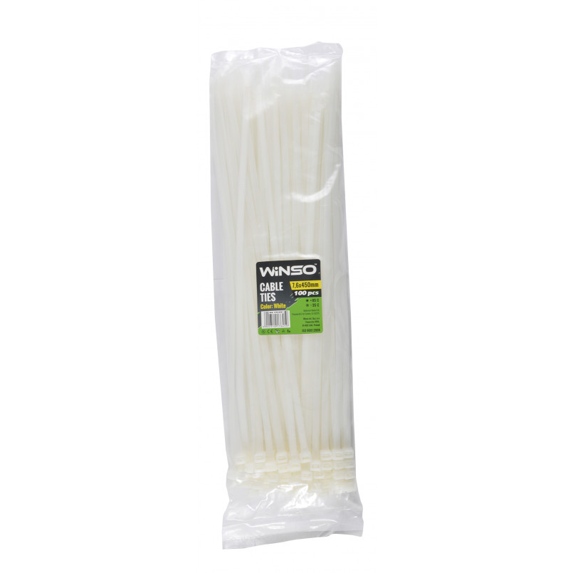 Опис: Пластикові хомути Winso широко використовуються як у виробництві, так і в побуті, але основною сферою є електротехніка. Хомути пластикові - економічний, швидкий і якісний засіб для обв’язки, кріплення, та фіксації кабелів, проводів, колісних ковпаків, рекламних банерів, та ряд інших речей. Нейлон 6,6 з якого виготовляють хомути, характерезується низьким коефіцієнтом тертя, нерозчинністю з більшістю органічних розчинників, стійкий до соленої води, слабких кислотних розчинів. Нейлон 6,6 чудово переносить високі навантаження і руйнується при температурі понад 120°С, стійкий до УФ випромінювання. Навантаження яке може витримати хомут напряму залежить від ширини стрічки хомута.