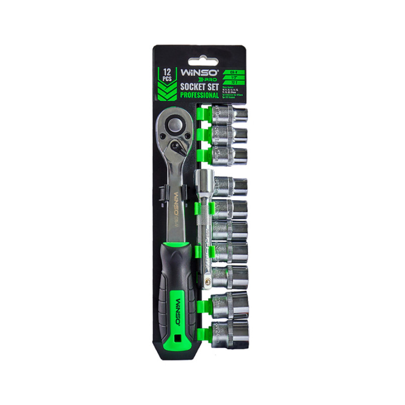 Опис: WINSO Професійний набір головок торцевих з тріскачкою та подовжувачем WINSO PRO, 1/2_ 72Т, CR-V, 10-24 мм,